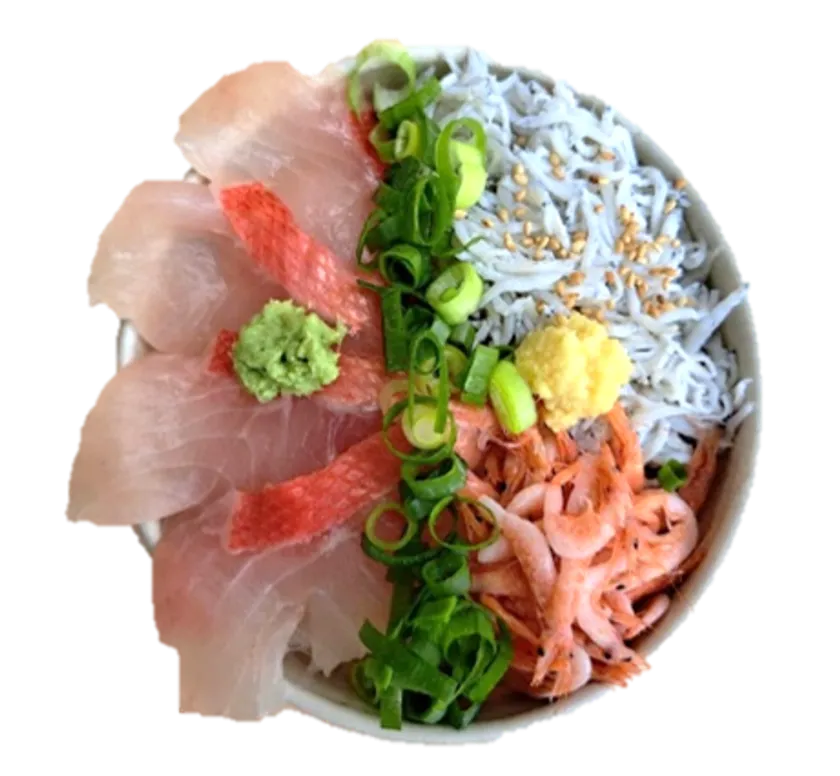 静岡県産金目鯛と静岡県産の釜揚げしらすと釜揚げ桜えび3種類の海の幸を一度に味わえる丼ぶりです。