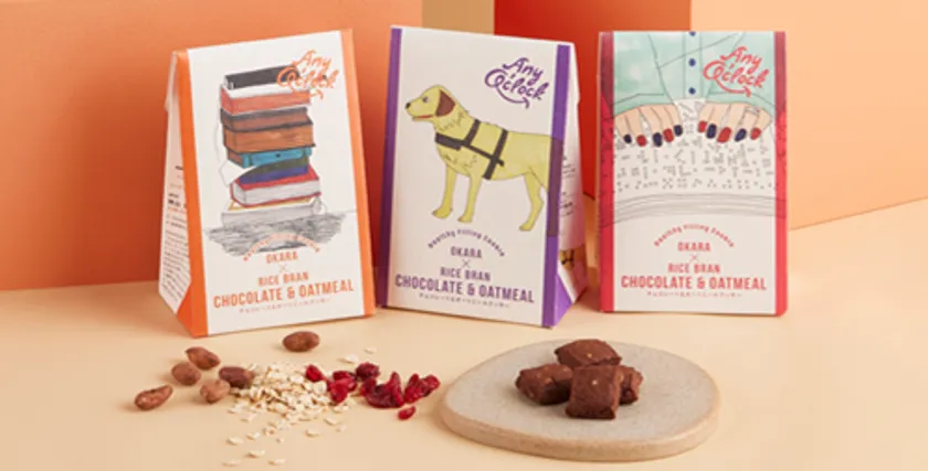 栄養豊富にも関わらず廃棄されることの多い「米ぬか」「おから」など、「食品として価値があるのに捨てられてしまう食材」を美味しくアップサイクルしたおやつのブランドです。栄養成分を付加するのではなく、食品に含まれている栄養素を無駄にすることなく手軽に摂取できる食品として商品化しました。これら廃棄される食材には、現在人に不足している栄養素が多く含まれるため、環境への配慮と、健康づくりの機能を兼ね備えています。