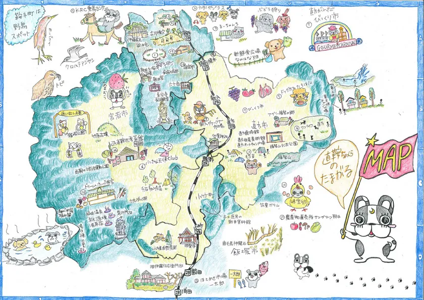 そこで、観光資源、地域資源を編集しなおし、“果物”“卵”“新鮮野菜”“歴史・文化”“犬”をキーワードに点としてではなく面として地域をアピールすることで、町外、県外からの来訪者が地域を回遊することで滞在時間が増え、地域を盛り上げる【地方創生としての賑わい】を作ろうと、障がい者就労支援施設 3事業所が自社の強みを活かし【情報収集・デザイン~仕上げまで】全て障がい者が作った手書きのMAPが完成しました。