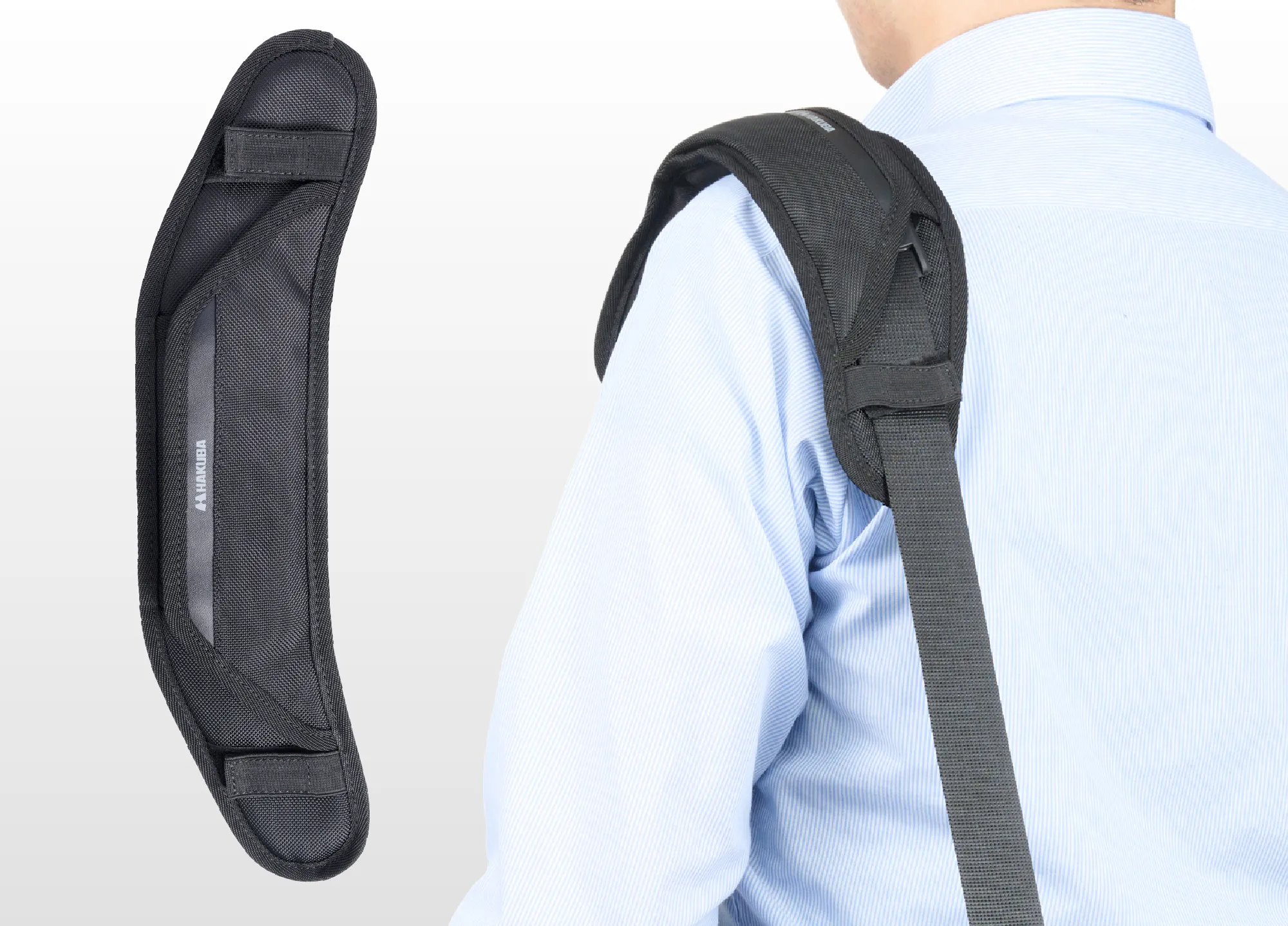 カメラバッグやビジネスバッグなどのショルダーストラップに取り付けることでバッグの荷重を分散し肩への負担を軽減します。ズレにくい構造で通気性も良く、優れた装着感でバッグを快適に持ち運ぶことができます。