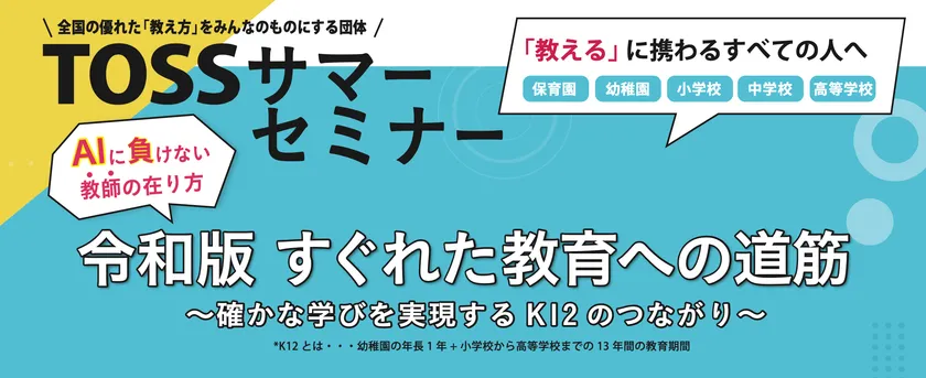 TOSSサマーセミナーでは、「令和型 すぐれた教育への道筋~確かな学びを実現するK12のつながり~」をテーマに、新しい教育と不変の教育技術を具体的にお伝えします。