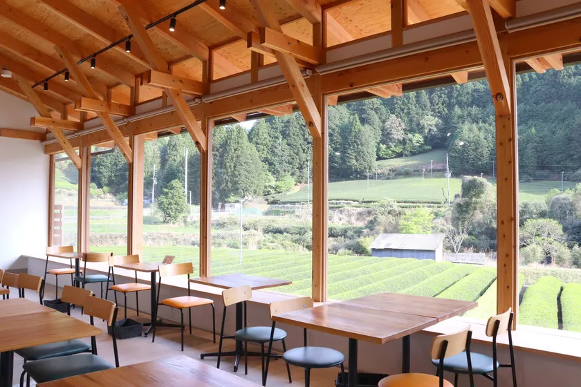 宇治茶の約6割の生産量を誇る、京都和束町。d:matcha本店は、和束町の雄大な茶畑を一望できるパノラマビューの大きな窓が特徴です。