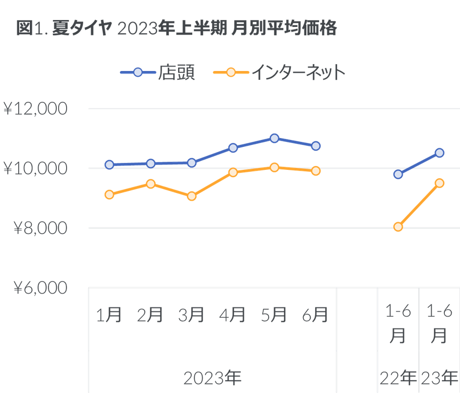 2023年上半期の数量前年比は5%減と微減であった。夏タイヤでは4月のメーカー出荷価格引き上げ前の特需はあったものの、前年ほどの盛り上がりを見せるには至らず、店頭では数量前年比7%減、インターネットでは同10%減とともにマイナス成長であった。出荷価格が引き上げられたことに伴い、店頭の平均価格は前年から7%上昇し10,516円、インターネットでは18%上昇し9,512円となった(図1)。この結果、金額前年比は店頭では前年並みに留まり、インターネットでは7%増と堅調に推移した。
