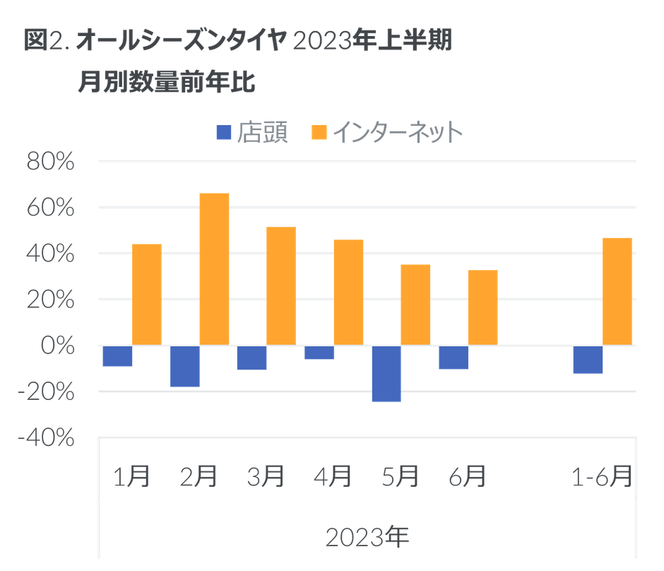 近年販売が増加しているオールシーズンタイヤは数量前年比21%増と二桁成長を見せた。店頭、インターネット別にみると、インターネットでは47%増と大きく伸長したものの、店頭では12%減と販売を落とした(図2)。