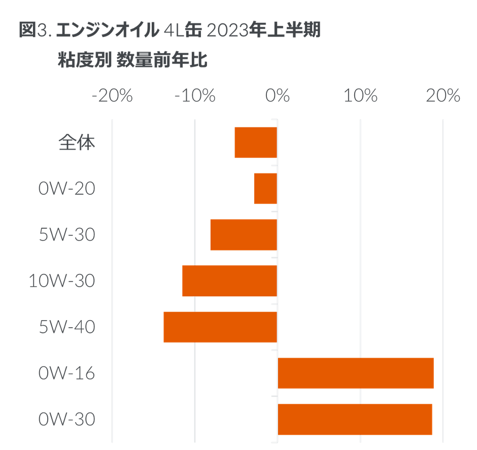 ・ エンジンオイル4L缶は数量前年比5%減のなか、粘度別に0W-16、0W-30はともに数量前年比19%増と大きく伸長した。