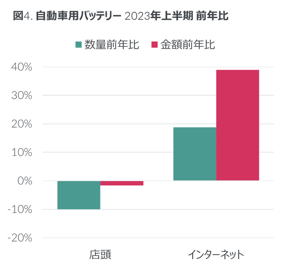 ・ 自動車用バッテリーは店頭の数量前年比が10%減と落ち込む中、インターネットでは同19%増に至った。