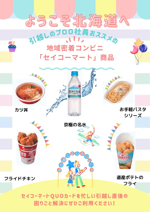 当社引越し作業員がお勧めする北海道発のコンビニエンスストア「セイコーマート」の商品案内と、セイコーマート限定デザインQUOカードを提供します。人口カバー率99.8%の北海道地域密型コンビニを知って利用してもらうことで、忙しい子育て世帯に転居直後も不安なく北海道での生活を始めてもらう取り組みです。