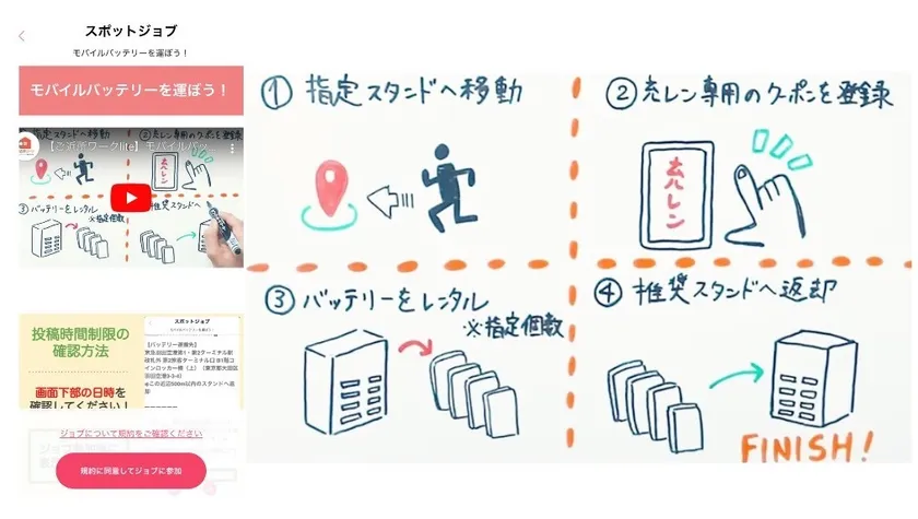 「ご近所ワークlite」内の「モバイルバッテリーを運ぼう!」というお仕事の内容のチュートリアルを今まで文章で説明してましたが、あまりメジャーな仕事ではないため「こういう仕事だよ」ということをシンプルに理解してもらうのが難しく新規のワーカーさんがなかなか増えませんでした。そのため仕事内容がすっきり頭に入るような動画で、興味を持ってくれる人がハードルを感じずに参加できるようにしたいと考えていたところ「お絵かきムービー」の紹介を受けました。初めて見た時に、手書きで描いているので飽きずに見ることができたので、急いでいる方も集中してみてもらえるのではないかと感じ導入に至りました。