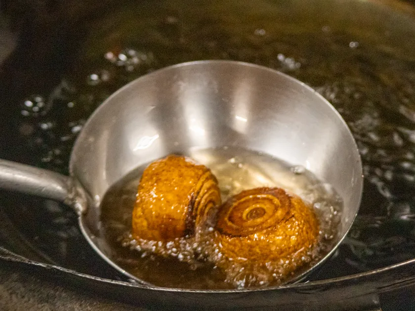 契約農家直送の玉ねぎを素揚げにして甘さを引き出す。