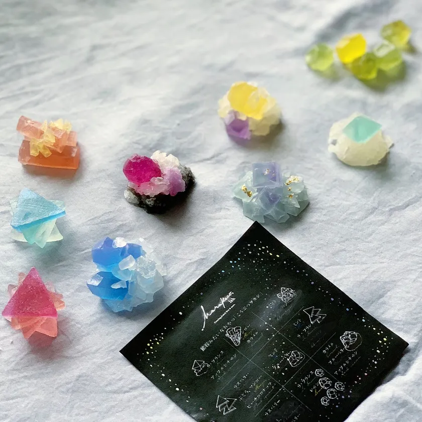 銀河のこうぶつヲカシは夏の夜空をイメージした物語性の強い作品です。夏らしい爽やかなお色味の中に、暗闇に光星々を散りばめました。そのひとつ一つが星の様であったり蛍石の様であったり幻想的な雰囲気を纏っている特別な箱をご用意いたします。