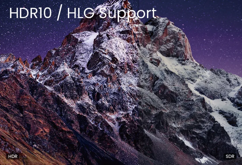 広いダイナミックレンジ、高輝度・高色域再現が特長になる新しい映像表示規格HDR表示が可能です。パッケージメディアや動画配信などで使われる「HDR10」と、4K放送やデジタル一眼カメラなどが対応する「HLG」方式を採用しています。