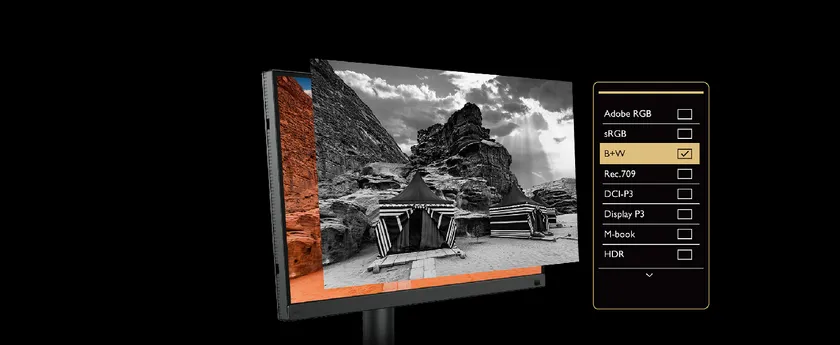 異なる色空間のコンテンツ、さらにモノクロ画像を横に並べて同時に表示できるGamutDuo機能を活用することで、比較作業の時間短縮につながります。