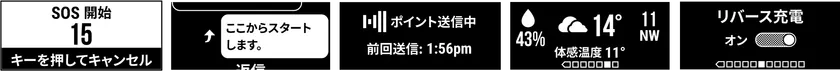 左から、インタラクティブSOSアラート、メッセージ送信、位置情報共有、天気予報、リバース充電