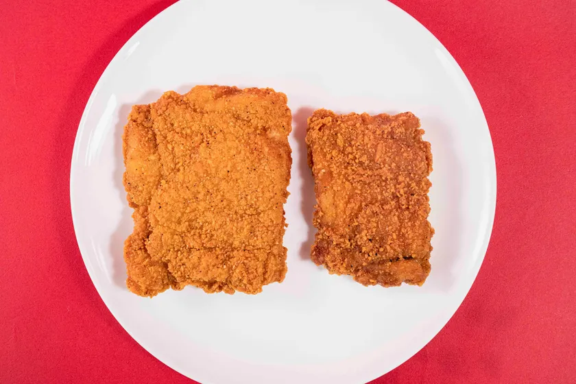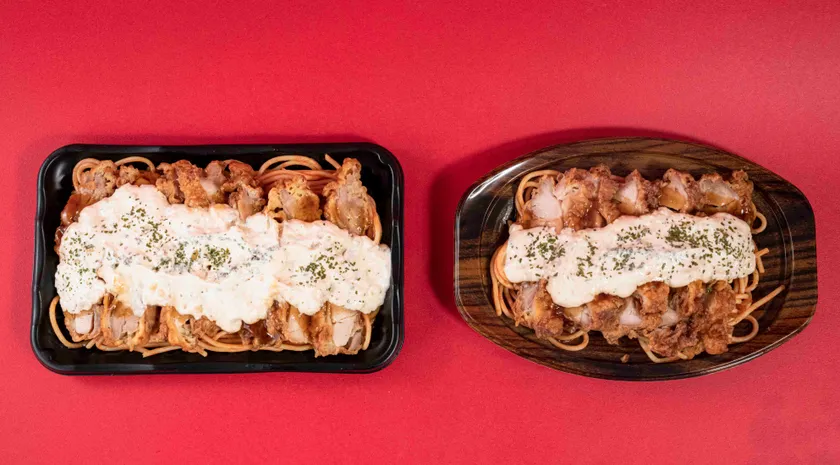 内容 :ジューシーな鶏唐揚げに、旨みのあるタルタルソース、甘酢ダレをトッピングしました。チキンもスパゲッティも、各種ソースもだいたい40%増量しました。