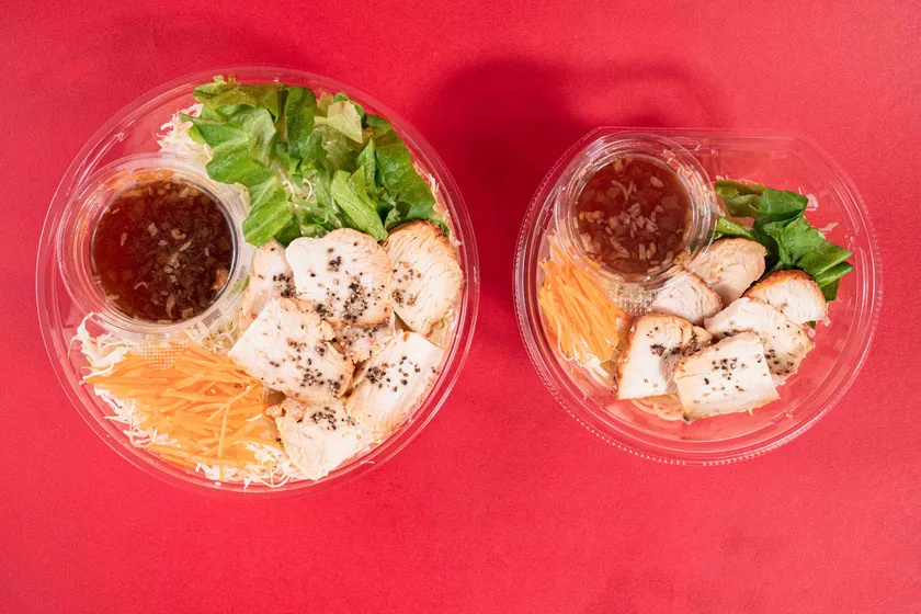 内容 :ローストチキンをトッピングしたパスタサラダで、たんぱく質も摂取できます。和風オニオンドレッシング付きです。具材もパスタもだいたい40%増量しました。
