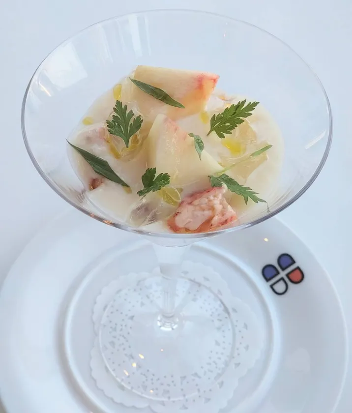 ポール・ボキューズでオマール海老といえば定番のオーロラソースを忍ばせ、蕪とズッキーニのサラダ、ヨーグルトの酸味とリカールの風味を纏わせ、桃の繊細な味わいを引き立てます。