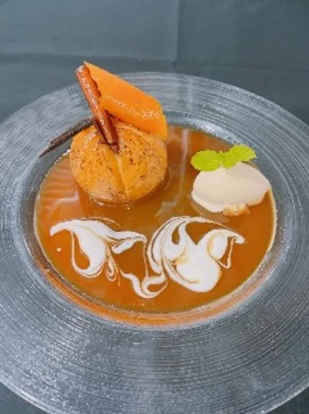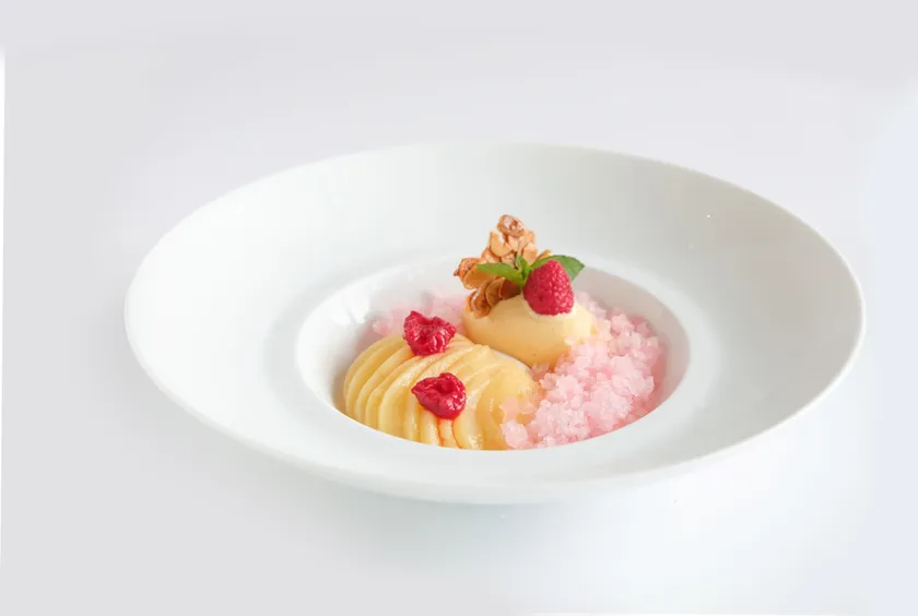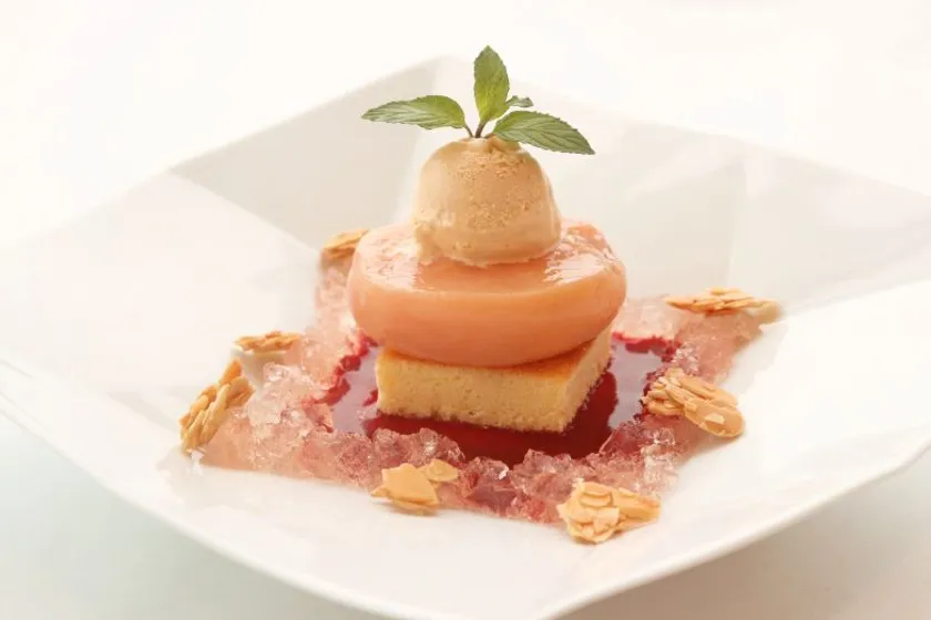 完熟した白桃をコンポートにして、マラスキーノで香りづけ。甘くてジューシーな福島の桃の美味しさを余すことなく表現します。桃のコンポートでできたシロップをグラニテにして、バニラアイスクリームと一緒に添えて、清涼感あふれる一皿に。