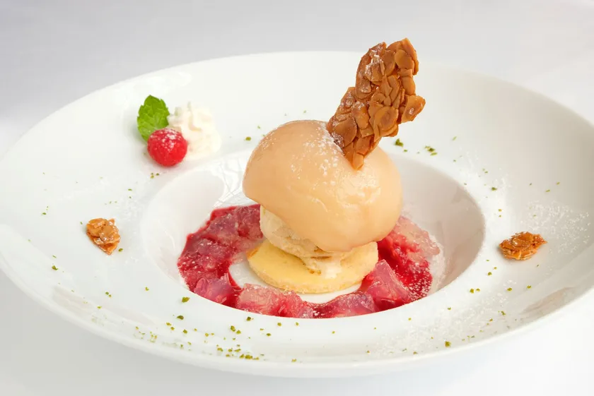白桃のジュレとラズベリーソースを敷いた上に、スポンジ、バニラアイスクリームと白桃のコンポートを重ねて。たっぷりとした大胆な盛り付けに心躍る。みずみずしい白桃の果汁がお口の中に広がります。