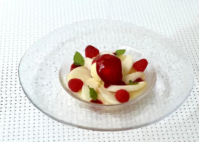 マダガスカル産のバニラアイスクリーム、フレッシュハーブのゼリーとラズベリーソースでお召し上がりいただきます。