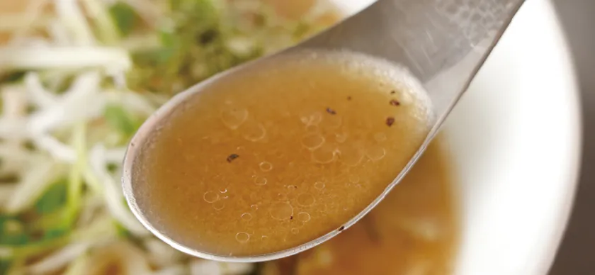 豚骨や鶏ガラなどの動物系素材を一切使用せず、マグロのアラをオーブンでローストし、強火で炊き上げ白濁させたツナコツ(鮪骨)スープ。動物系を一切使用していませんが、ゼラチン質をたっぷり含む力強いスープに仕上がっています。アクセントとして使用する「柚子胡椒」が風味をより一層引き立てます。