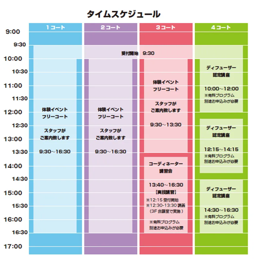 ・ディフューザー認定講座、コーディネーター講習会(有料)は別途お申込みが必要となります。