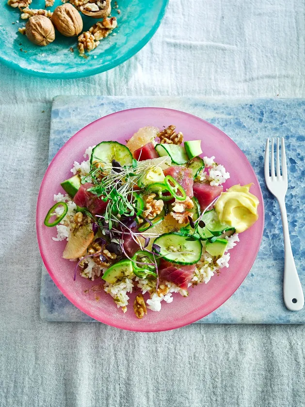 4. お皿にご飯を盛り、まぐろ、きゅうり、アボカド、くるみ、グリーンチリペッパー、グレープフルーツ、かいわれ大根をのせる。2のライムドレッシングをかけ、3のわさびマヨネーズを添える。