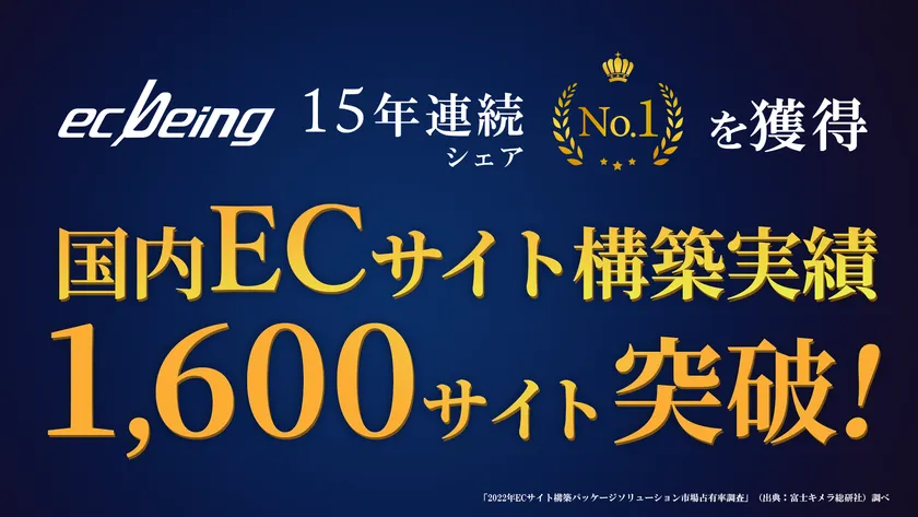 株式会社ecbeing(イーシービーイング、本社:東京都渋谷区、代表取締役社長:林 雅也、以下 ecbeing)は、2022年度において国内ECサイト構築実績1,600サイトを突破し、株式会社富士キメラ総研の発行するソフトウェアビジネス新市場2023年版による【ECサイト構築パッケージソリューション市場占有率調査】において、15年連続国内シェアNo.1を獲得しました。