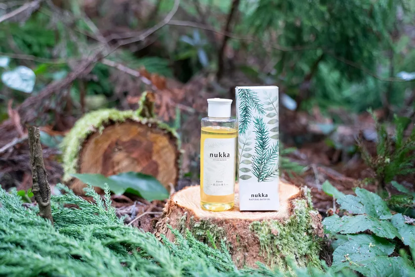 nukkaは阿蘇くじゅう地域、特に黒川温泉のある阿蘇郡南小国町の自然資源を活用したバスオイルです。着目したのは私たちの里山の原風景にある「小国杉」。使われずに山に放置された枝葉は、災害や人災の原因の一つにもなります。これら枝葉を地域の大切な資源と捉え、葉から抽出したオイルを本商品に採用いたしました。併せて黒川温泉の温泉水を源泉から採取して配合。自然環境に極力負荷をかけない資源利用を選択しています。
