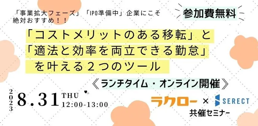 ビルオーナーと移転企業との直接マッチングプラットフォーム「SERECT」を運営する株式会社Lexi(本社:東京都千代田区、代表取締役:小堀 恵一、以下 Lexi)は、客観的記録を利用した適法な勤怠管理を効率的に運用できる勤怠管理サービス「ラクロー」を運営する株式会社ラクロー(本社:神奈川県相模原市、代表取締役:岩崎 奈緒己、以下 ラクロー)とウェビナーを開催することをお知らせします。