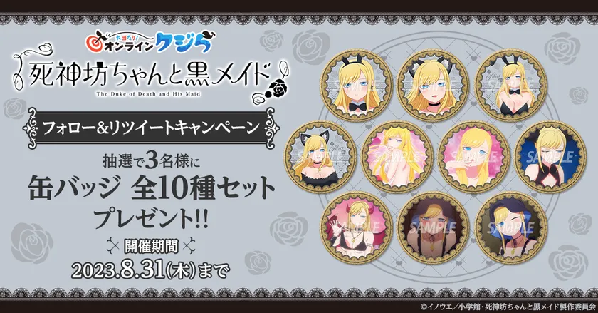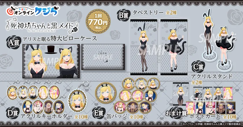 株式会社小学館ミュージック&デジタルエンタテイメントが提供するオンラインくじサービス「大当たり!オンラインクジら」にて、2023年8月2日より『死神坊ちゃんと黒メイド』バニー&猫耳アリス オンラインクジらを販売開始いたします。