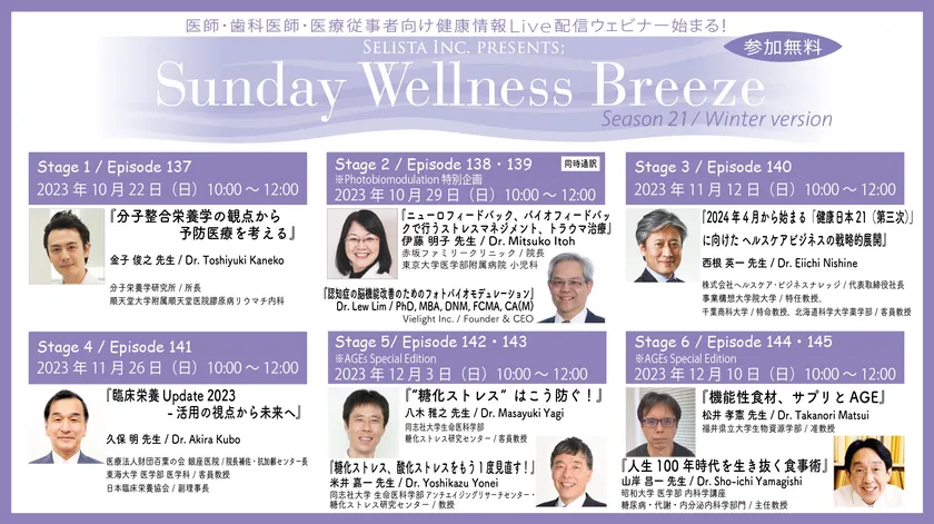 《医師・歯科医師・薬剤師・医療従事者限定 無料オンラインセミナー》 抗加齢医療・生活習慣病予防・統合医療・最適健康医療の 最新情報が学べる!『Sunday Wellness Breeze Season 21』 全6Stage 9講演開催決定/セリスタ株式会社
