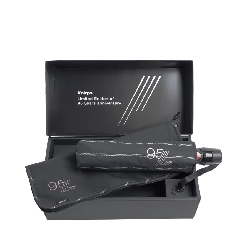 「クニルプス 95周年セット」の内容は、アイコンモデル T.220の折りたたみ傘と濡れた傘を入れられるDry Bag(ドライバッグ)の特別仕様セットです。ロングセラー Gatsby Black(ギャッツビーブラック)柄とシャンパンゴールドの記念ロゴが、95周年を華やかに祝福します。シリアルナンバープレート付き、スペシャルギフトボックス入り、300セットの限定販売です。いつの時代も先端のデザインとテクノロジーで人々を魅了する、永遠のクニルプスへ。
