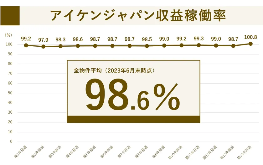 下記グラフは2023年6月末時点の収益稼働率実績で、全物件平均の収益稼働率は98.6%。築年数が経っても、新築時から変わらず高い収益を得ていることが分かります。
