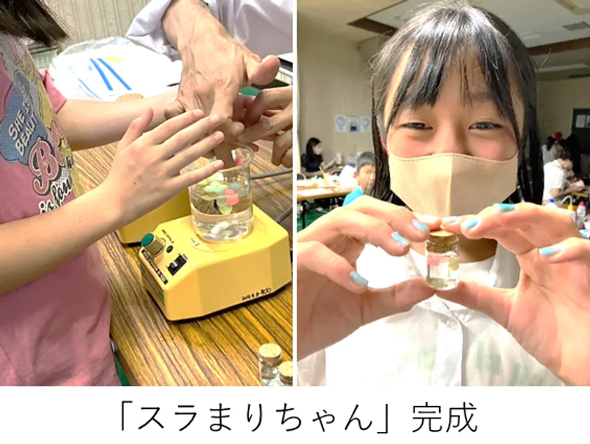 ぷにゅぷにゅしたりデコレーションをしたりして楽しく遊べるスライムですが、実はスライムには科学的要素がたくさん含まれています。スライムと同じように水が閉じ込められたコンニャクやゼリーとの違いを体験しながら科学の原理を学び、「スライムまりも」づくりに挑戦しました。3つの講座で計240人の子ども達と同伴した保護者らが、国際研究歴30年の医学博士の指導のもとで、スライムでクラゲのように光る「まりも」を作りながら自由研究や自由工作の進め方を学びました。