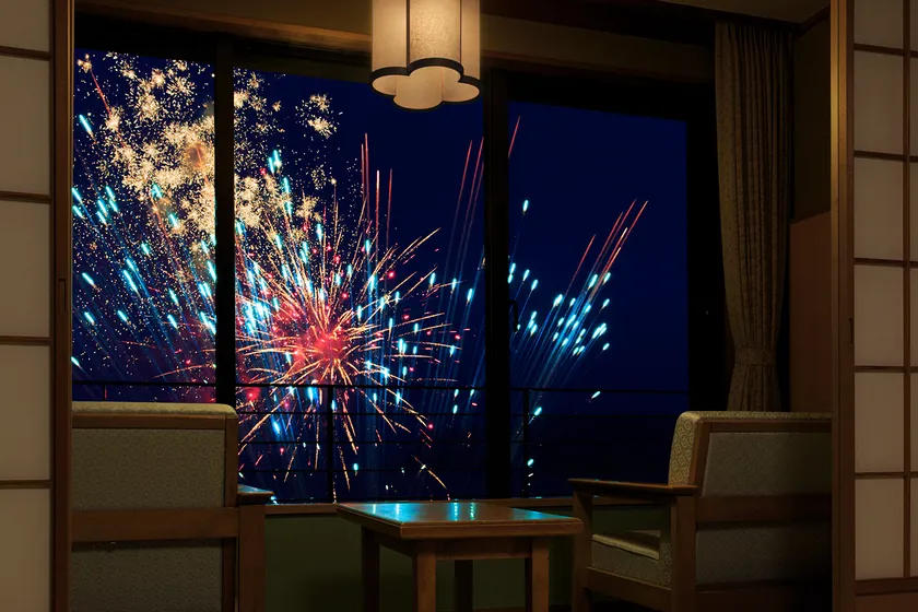 ホテル前から打上げを行う「銀水花火」は、夕食後のひとときにゆっくりくつろぎながら、館内から花火をお楽しみいただけます。