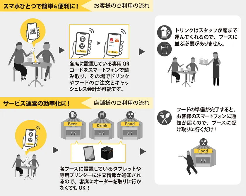 会場内にて、お客さまが商品注文時に各席に設置してある注文用QRコードをスマートフォンで読み取ることで、テーブルでの注文と、その場でのキャッシュレス決済が可能となります。