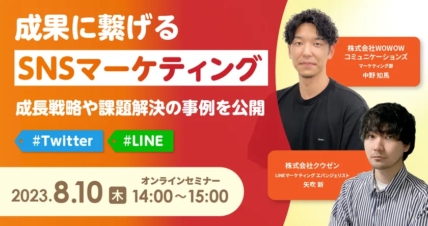 株式会社WOWOW コミュニケーションズ(本社:神奈川県横浜市、代表取締役 社長執行役員:山崎 一郎)は、2023年8月10日(木)に、株式会社クウゼン様(本社:東京都千代田区、代表取締役:太田 匠吾)と共催セミナー『成果に繋げるSNSマーケティング ~成長戦略や課題解決の事例を公開~#Twitter #LINE』を開催いたします。