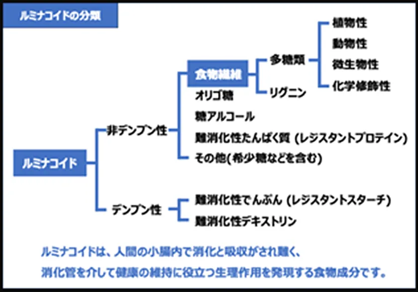 ルミナコイドは、食物繊維、オリゴ糖、糖アルコール、難消化性たんぱく質(レジスタントプロテイン)、希少糖、難消化性でんぷん(レジスタントスターチ)、難消化性デキストリンなどの総称で、それぞれ分子量、分子構造、水溶解性などの特性が異なります。そのため、大腸内の広範囲に棲む多種多様な微生物が発酵に要する時間も、届く腸管部位も、産生される短鎖脂肪酸である各有機酸(酪酸、プロピオン酸、酢酸など)の産生率もそれぞれ異なると考えられます。