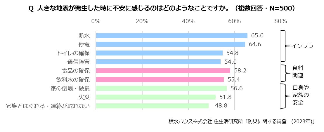 大きな地震が発生した時に不安に感じることでは、「断水」(65.6%)、「停電」(64.6%)とライフラインに関わるインフラを挙げた人が最も多い結果になりました。「食品の確保」や「飲料水の確保」などの食料関連、「家の倒壊・破損」「家族とはぐれる・連絡がとれない」などの自身や家族の安全に関わる項目も約半数が回答しており、地震に対して様々な不安を感じている人が多いことがわかりました。
