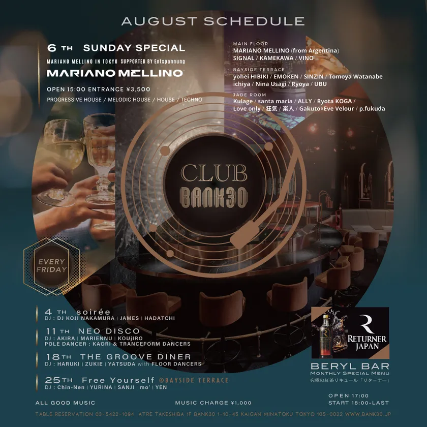 また、8月6日(日)には海外よりのDJを迎えCLUB BANK30 SPECIALとして「MARIANO MELLINO IN TOKYO SUPPORTED BY Entspannung」を開催。