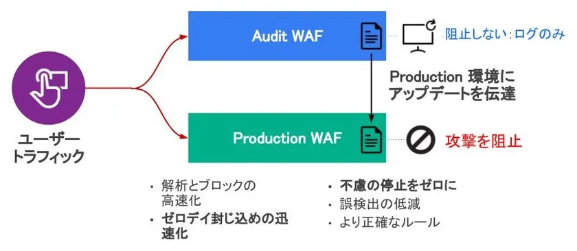 2. デュアルWAFモード(Audit WAFとProduction WAFの同時並行運用)を採用することにより、解析時間を短縮し、ゼロデイ攻撃への対応を迅速に行うことが可能となります。また現状の運用環境に影響を与えることなく、最新のセキュリティルールを反映することができます。