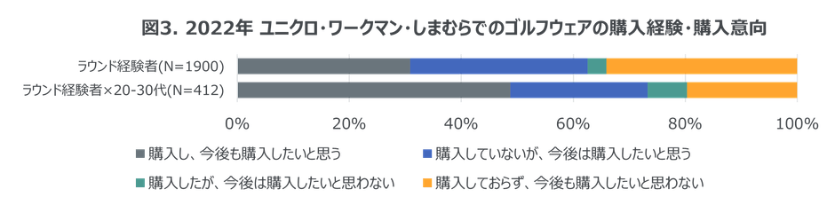 本調査ではラウンド経験者以外にも、ゴルフをしたことは無いが、今後は始めてみたいと回答した「ゴルファー予備軍」に対しても調査を行った。ゴルファー予備軍が「ゴルフのマイナス面」として「お金がかかる」と答えた割合は8割以上とラウンド経験者よりも高く、ラウンドデビューに備えて選ぶゴルフウェアとして、価格メリットのあるファストファッションブランドが購入候補に挙がることは十分考えられる。ファストファッションブランドの継続的な購入意向が高い傾向にあることから、ゴルフアパレルブランドはゴルファー予備軍に対して、特有の価値を届けることで差別化を図ることが益々重要となりそうだ。