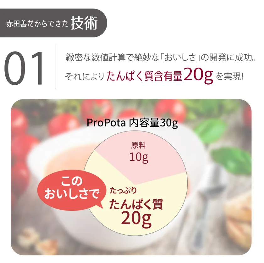 ProPota(R)は、トマトポタージュ味のプロテインパウダーです。たんぱく質を効率よく摂取するのに、食事としておいしい、満足できるプロテインパウダーを開発しました。
