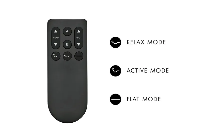 リモコンのボタン1つで、3つの基本モード「リラックス」「アクティブ」「フラット」へと簡単にスタイルチェンジします。背もたれの角度と脚の高さを自分好みに設定できる「カスタム登録」機能も搭載し、ワンタッチで自分にとって最高のポジションへと導きます。
