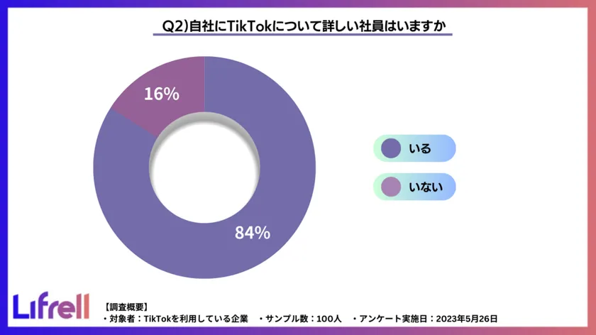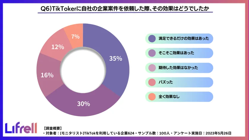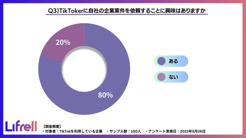売上アップにコミットすることをミッションとし、デジタルマーケティングの戦略立案から実行までを支援している株式会社LIFRELL(本社:東京都品川区、代表取締役:佐藤 祐介)は、TikTokを利用している企業100社に「企業のTikToker活用についてのアンケート調査」を実施しました。