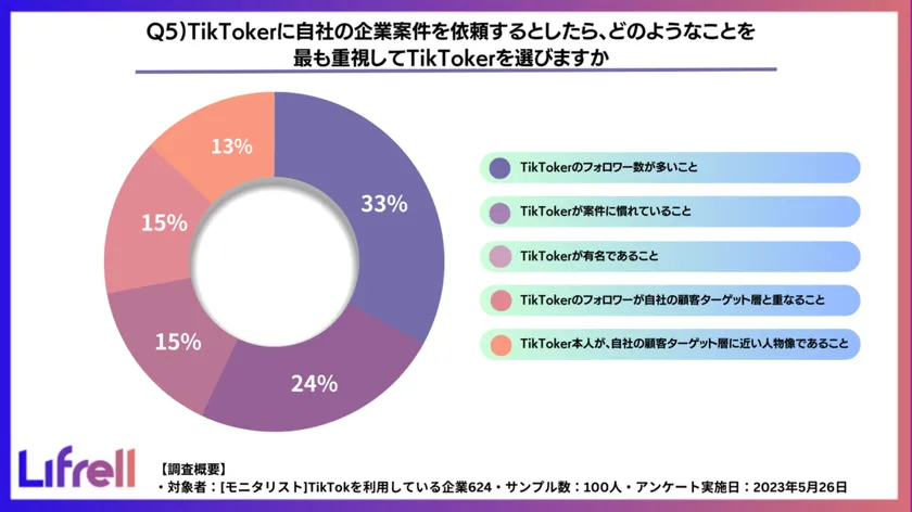 TikTokerを選ぶ際の基準は、1位が「フォロワー数が多いこと(33%)」、2位が「TikTokerが案件に慣れていること(24%)」、3位が「TikTokerが有名であること(15%)」と「TikTokerのフォロワーが自社の顧客ターゲット層と重なること(15%)」となっており、企業はフォロワーが多く発信力や影響力があり、PR案件に慣れているTikTokerを選ぶ傾向があることがわかりました。