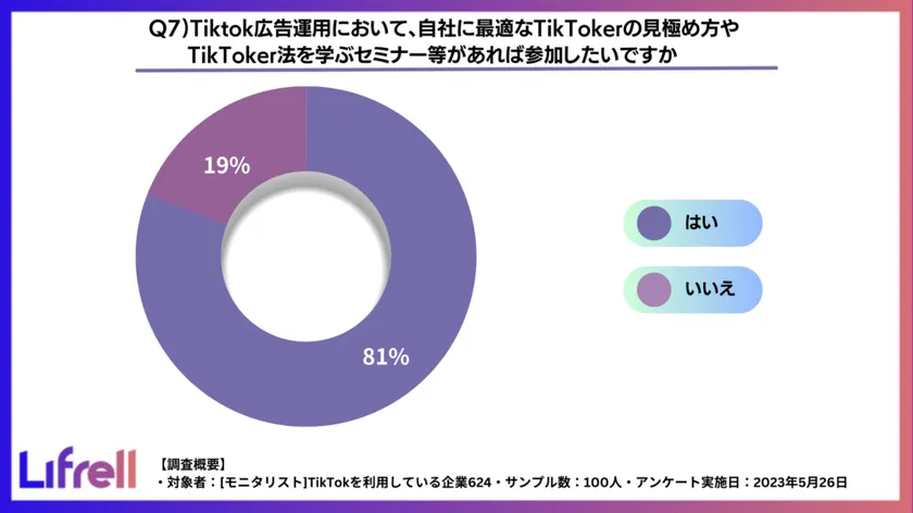それでも、「TikTok広告運用において、自社に最適なTikTokerの見極め方やTikToker活用法を学ぶセミナー等があれば参加したいですか」という質問に対しては8割以上が「参加したい」と回答しています。