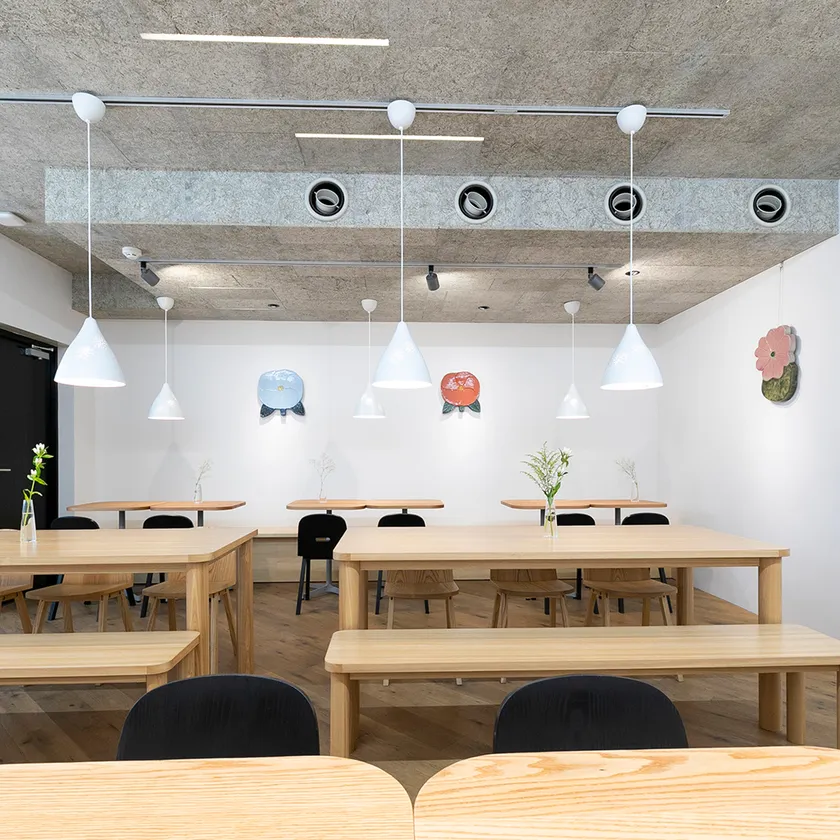 同じ建物の2階から4階にある北欧フィンランドデザインのカプセルホテル(MAJA HOTEL KYOTO マヤホテルキョウト、2019年12月開業)をデザインしたフィンランドの世界的プロダクトデザイナー/ハッリ・コスキネンが、ホテルのデザインと統一されたフィンランドデザインでまとめられた内装デザインになっております。内装にはナチュラルな木製のテーブルやベンチ、フィンランドを代表する照明デザイナー/リサ・ヨハンソン=パッペがデザインした照明、またフィンランドで居間やコテージで敷物などに伝統的に使われている織物のRagrug(ラグラグ)を現地から取り寄せてベンチカバーやクッションに使用しております。