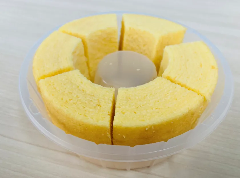6等分にカットされたバウムクーヘンがトレーに入っており、包丁要らず、お皿要らずで手軽にお召し上がりいただけます。