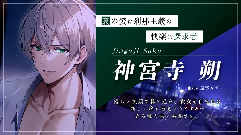 表では産婦人科医として勤務し、仕事の熱心さ・親身な診療から患者から評判のいい神宮寺ですが、貴女に見せる裏の顔では快楽に溺れ苦しむ姿を見たがるなど嗜虐的な一面も。